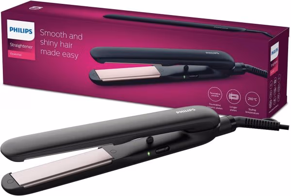 Specially designed for speed and ease of use, the longer plates of the Essential Care straightener allow you to get the straight look you want faster, while being gentle on your hair. Long plates The longer plates enable a better contact with the hair and help you achieve perfect straightening results in less time. 210 DegreeC professional temperature This high temperature enables you to change the shape of your hair and gives you that perfect look you want. Instant heat up The straightener has a fast heat up time, being ready to use in 60 seconds. Handle closing lock The straightener has a closing lock mechanism. Located at the base of the straightener, this locks plates, making storage quick and easy and helping to protect the straightener from accidental damage. Swivel cord Useful swivel cord technology rotates the cord to prevent tangled wires. Ceramic-Tourmaline coating Ceramic-Tourmaline plates emit negative ions which creates shiny, static and frizz-free hair.