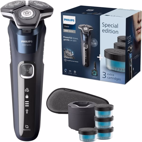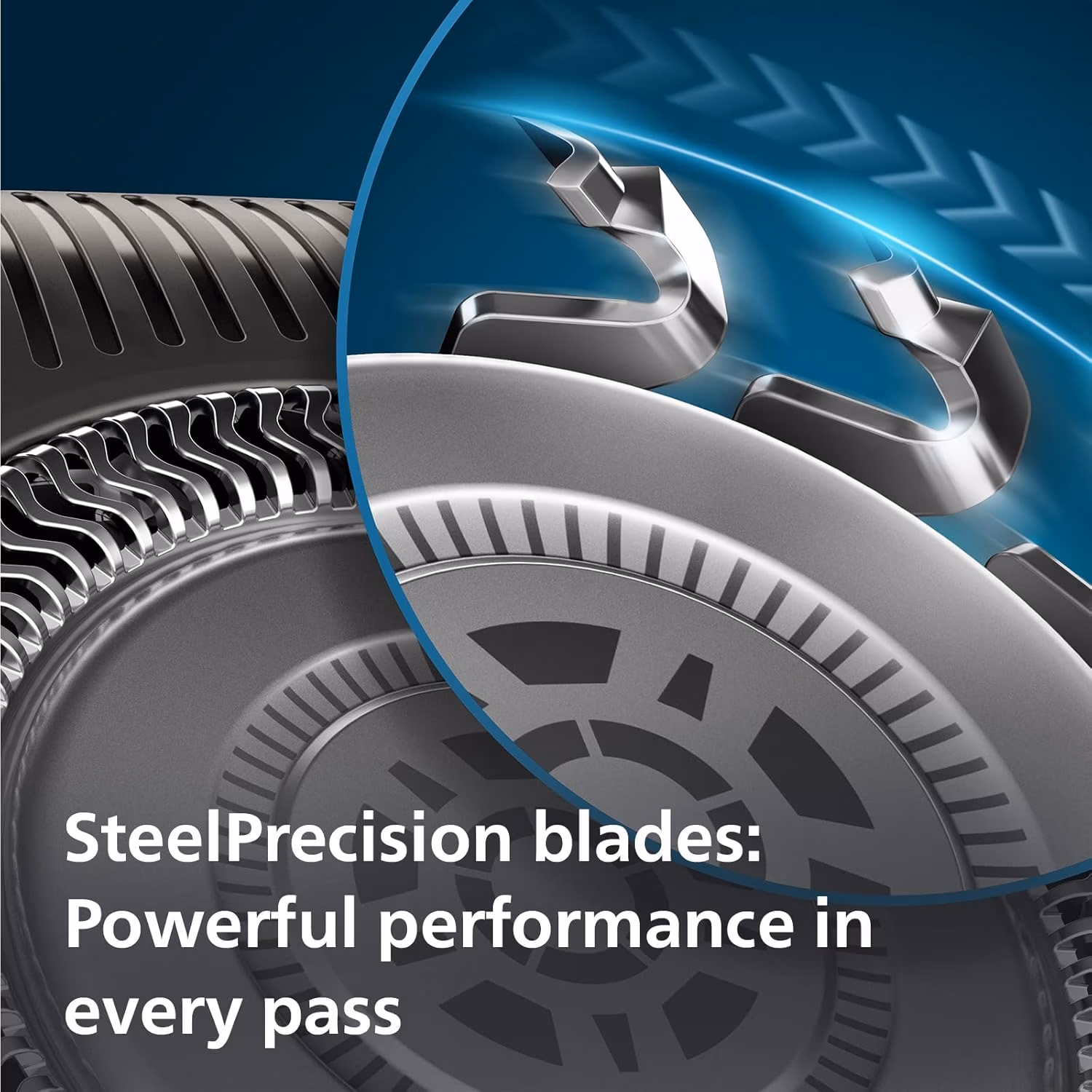 From worldโs #1 Electric shaver brand**: The Philips Series 5000 delivers a powerful shave, cutting now even more hair per stroke*. This beard shaver is equipped with advanced SkinIQ technology, the shaver senses and adapts to your hair density, for improved skin comfort. The SteelPrecision blades shave close, with up to 90,000 cutting actions per minute, cutting more hair per stroke*. The 45 high-performance blades are self-sharpening and are made in Europe. Our improved Hair-Guide Precision heads are engineered for precision. The surface is enhanced with hair-guiding channels, designed to move hair into an effective cutting position for a smooth shave every time. Complete your look using the shaver’s pop-up precision trimmer. Integrated into the shaver’s body, it’s the perfect way to maintain a moustache and trim sideburns. The One-touch open allows you to quickly and easily clean and maintain your Philips Shaver Series 5000 electric shaver. Simply flip it open with the touch of a button and rinse it with water. Shave for longer with 60 minutes of cordless shaving and only a 1-hour charge time. *Tested versus Philips Series 3000. **Euromonitor International Limiter, retail sales value, per body shavers category definition, 2022 data, research conducted in December 2022